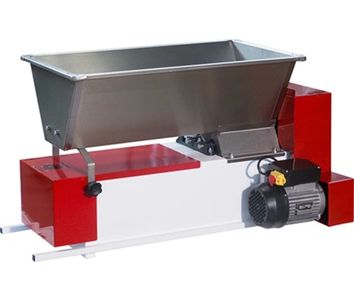 Bunches of grapes are fed into the hopper. The machine ejects the stems out the side and allows the crushed grapes and juice to be collected below.